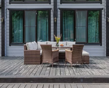 Комплект мебели King set and chair — это идеальный выбор для семейного отдыха и вечерних посиделок с друзьями. Включает большой угловой диван, рассчитанный на 5-6 человек, два мягких пуфа, кресло и стильный обеденный стол с прочной стеклянной столешницей.