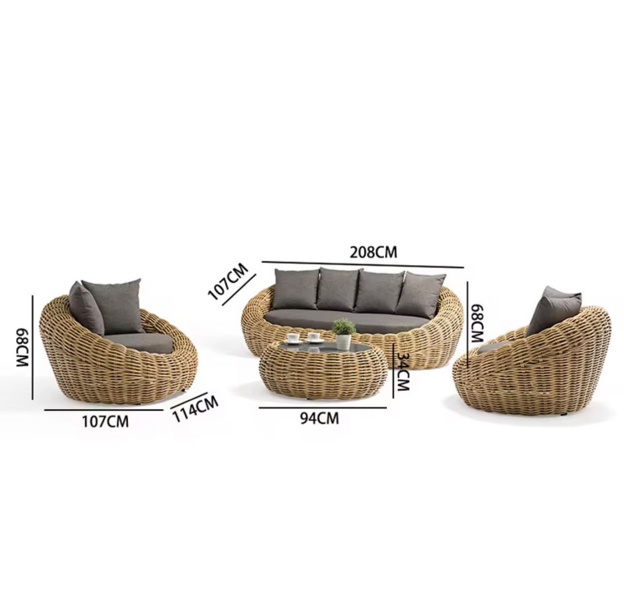 Все элементы мебели изготовлены из качественных материалов: алюминиевый каркас и искусственный ротанг. Ротанг — это прочный и легкий материал, который не требует особого ухода и отлично переносит воздействие внешней среды. Алюминий обеспечивает прочность и стабильность всего каркаса.
