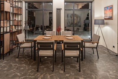 Столешница и подлокотники: Столешница выполнена из тика, что придает обеденному столу натуральный и изысканный вид. Тик также известен своей высокой стойкостью к влаге и ультрафиолетовому излучению, делая его идеальным для использования на открытом воздухе. Подлокотники кресел также выполнены из тика.